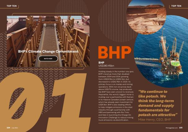 Holding steady in the number one spot , BHP ’ s revenue more than doubled between 2004 and 2014 , growing from US $ 24.9bn to US $ 52.1bn , but decreased to US $ 42.9bn in 2020 . Its primary focus is on metals and mining operations . With iron ore prices back above US $ 170 a tonne , top producers like BHP have seen a boost to revenues . Meanwhile , the world ’ s biggest miner is mulling over a partnership with Nutrien in its massive Canadian potash venture , which has already seen investment hit US $ 4.5bn . BHP is also leading efforts to help mitigate emissions in the steel industry through a partnership with HBIS and partnering with Rio Tinto and Vale in launching the Charge On Innovation Challenge to reduce mining truck emissions via electrification .