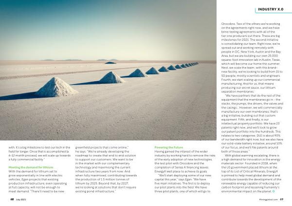 Orocobre . Two of the others we ' re working on the agreements right now , and we have brine testing agreements with all of the tier one producers out there . These are big milestones for 2021 . The second initiative is consolidating our team . Right now , we ' re spread out and working remotely with people in DC , New York , Austin and the Bay Area , but we are building our own 25,000 square-foot innovation lab in Austin , Texas , which will become our home this summer . Next , we scale the team ; with this brandnew facility , we ' re looking to build from 15 to 50 people , mostly scientists and engineers . Fourth , we start scaling up our commercial manufacturing . And for us , that means producing our secret sauce , our lithium separation membranes .