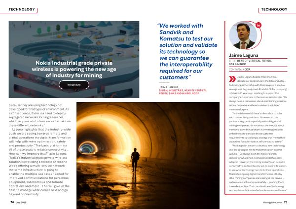 Laguna highlights that the industry-wide push we are seeing towards remote and digital operations via digital transformation will help with mine optimisation , safety and productivity . “ The basic platform for all of these goals is reliable connectivity … How can we improve that ?” asks Laguna . “ Nokia ’ s industrial grade private wireless solution is providing a reliable backbone . We ’ re offering a multi-service network ; the same infrastructure is going to enable the multiple use cases needed for improved communications for personnel , equipment , autonomous and remote operations and more … This will give us the base to manage what comes next and go beyond connectivity .”