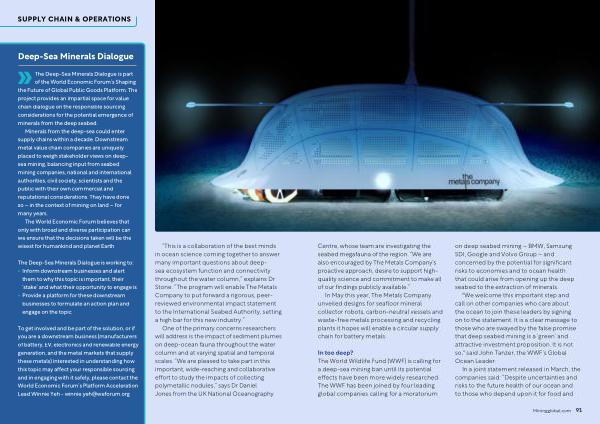 The Deep-Sea Minerals Dialogue is part of the World Economic Forum ’ s Shaping the Future of Global Public Goods Platform . The project provides an impartial space for value chain dialogue on the responsible sourcing considerations for the potential emergence of minerals from the deep seabed .