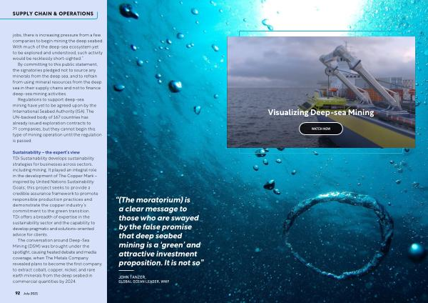 Sustainability – the expert ’ s view TDi Sustainability develops sustainability strategies for businesses across sectors , including mining . It played an integral role in the development of The Copper Mark – inspired by United Nations Sustainability Goals ; this project seeks to provide a credible assurance framework to promote responsible production practices and demonstrate the copper industry ’ s commitment to the green transition . TDi offers a breadth of expertise in the sustainability sector and the capability to develop pragmatic and solutions-oriented advice for clients .