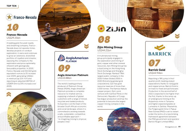 A leading gold-focused royalty and streaming company , Franco- Nevada does not operate mines , develop projects or conduct exploration ; it owns and continues to grow an extensive , diversified portfolio of royalties and streams , exposing the company to the exploration and price optionality inherent with geologically favourable properties . In 2020 , Franco-Nevada sold 521,564 goldequivalent ounces ( a 1 % increase over 2019 ), generating US $ 1bn in revenue ( up 21 % YoY ) and reporting an adjusted EBITDA of US $ 839.6mn ( a 25 % increase over 2019 ).