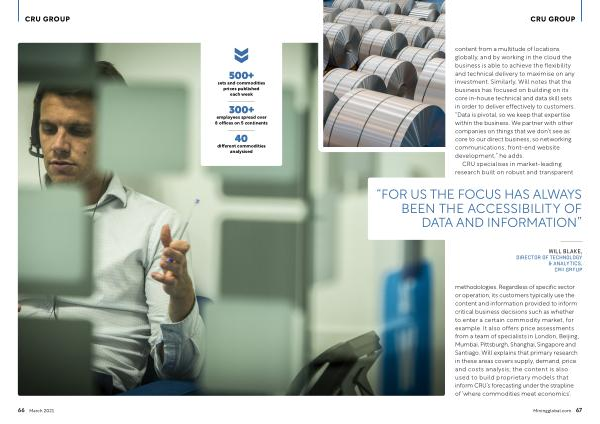 methodologies . Regardless of specific sector or operation , its customers typically use the content and information provided to inform critical business decisions such as whether to enter a certain commodity market , for example . It also offers price assessments from a team of specialists in London , Beijing , Mumbai , Pittsburgh , Shanghai , Singapore and Santiago . Will explains that primary research in these areas covers supply , demand , price and costs analysis ; the content is also used to build proprietary models that inform CRU ’ s forecasting under the strapline of ‘ where commodities meet economics ’.