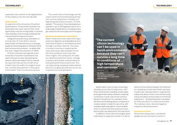 Big data and spatial data visualisation Smart mines are mines where the major assets are digitized via embedded sensors that transmit data to a centralized location through a wireless network . The value of a smart mine lies in exploring the clear and robust data available across the mine workflow to provide realtime insights . Once analysed , the data can identify production issues , manage inventory and quality , track production and asset performance and costs . This can help mining companies make optimal decisions to generate efficiencies across its production and operations .