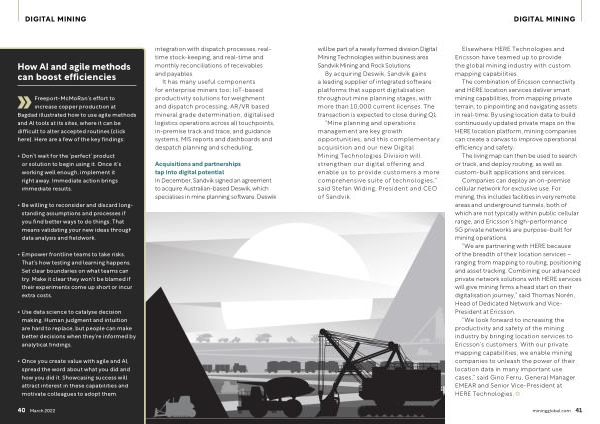“ We look forward to increasing the productivity and safety of the mining industry by bringing location services to Ericsson ’ s customers . With our private mapping capabilities , we enable mining companies to unleash the power of their location data in many important use cases ,” said Gino Ferru , General Manager EMEAR and Senior Vice-President at HERE Technologies . miningglobal . com 41