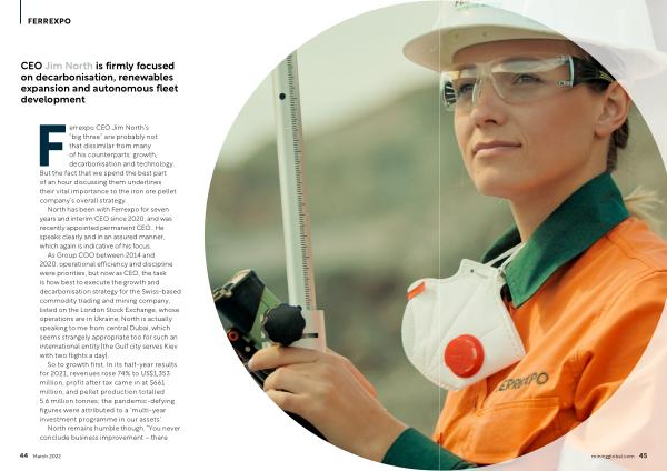Ferrexpo CEO Jim North ’ s “ big three ” are probably not that dissimilar from many of his counterparts : growth , decarbonisation and technology . But the fact that we spend the best part of an hour discussing them underlines their vital importance to the iron ore pellet company ’ s overall strategy .