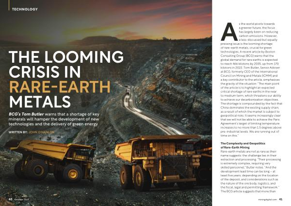 As the world pivots towards a greener future , the focus has largely been on reducing carbon emissions . However , a less-discussed but equally pressing issue is the looming shortage of rare-earth metals , crucial for green technologies . A recent article by Boston Consulting Group ( BCG ) warns that the global demand for rare earths is expected to reach 466 kilotons by 2035 , up from 170 kilotons in 2022 . Tom Butler , Senior Adviser at BCG , formerly CEO of the International Council on Mining and Metals ( ICMM ) and a key contributor to the article , emphasises the gravity of the situation : “ The main point of the article is to highlight an expected critical shortage of rare earths in the near to medium term , which threatens our ability to achieve our decarbonisation objectives . The shortage is compounded by the fact that China dominates the existing supply chain , as a result of which the market is subject to geopolitical risks . It seems increasingly clear that we will not be able to achieve the Paris Agreement ’ s target of limiting temperature increases to no more than 1.5 degrees above pre-industrial levels . We are running out of time on this .”