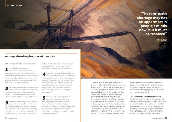 Butler , meanwhile , is an advocate of global collaboration . “ Although governments were initially slow to take action on this , it is encouraging to see there is now broad acknowledgement of the challenge . Over the last few years many countries have articulated critical minerals strategies . Some countries , like the USA , are directly supporting the private sector in this area with equity investments . And as the article highlights , the French have established an “ observatory ” to develop technical and economic solutions in the critical minerals sector . I do think there is a pressing need for still greater collaboration and also a global knowledge centre and ‘ warehouse ’ for information exchange . We have an International Energy Agency but this does not yet exist for mining .”