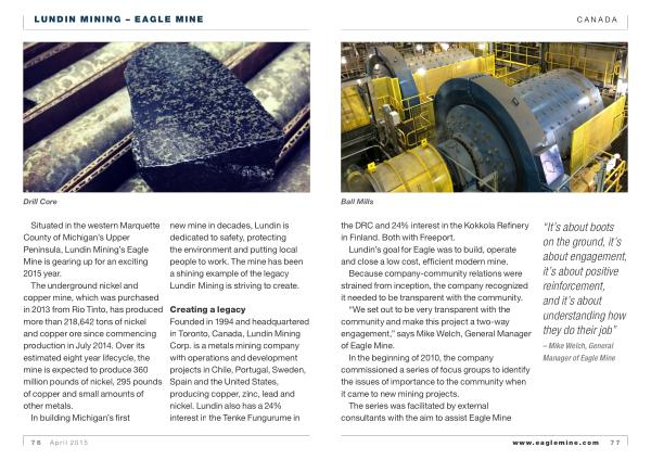 Situated in the western Marquette County of Michigan ’ s Upper Peninsula , Lundin Mining ’ s Eagle Mine is gearing up for an exciting 2015 year .
