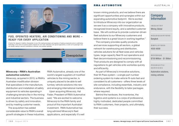 RMA AUTOMOTIVE australia known mining products , and we believe there are significant opportunities and synergies within our expanding automotive footprint . We ’ re excited to introduce Minecorp into our organization as we see it as a company with innovative products , recognized brand equity , and a satisfied customer base . We will continue to provide customer-driven fleet solutions to our Minecorp customers and believe there is a great future in working together .”