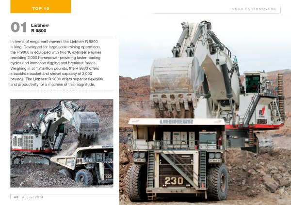 In terms of mega earthmovers the Liebherr R 9800 is king . Developed for large scale mining operations , the R 9800 is equipped with two 16-cylinder engines providing 2,000 horsepower providing faster loading cycles and immense digging and breakout forces . Weighing in at 1.7 million pounds , the R 9800 offers a backhoe bucket and shovel capacity of 3,000 pounds . The Liebherr R 9800 offers superior flexibility and productivity for a machine of this magnitude .