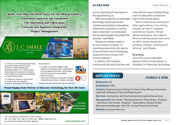 Industry : Engineering and Design for Heavy Clay , Mining , Automotive , Light Rail , Adhesives , Paint and Plasterboard Services : mechanical , electrical and general engineering services Management : Ken Smale - Managing Director , Ross Smale - Engineer - Electrical , Colin Smale - Engineer – Applications , Gordon Smale – Manufacturing Manager , Ron Hill – Group Financial Controller Website : www . jcsmale . com