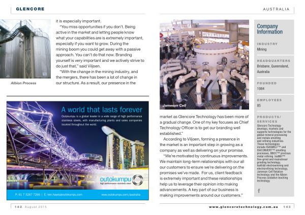 Glencore Technology develops , markets and supports technologies for the global mineral processing and metals smelting and refining industries . These technologies include ISASMELT™ and ISACONVERT™ smelting processes , BBOC™ precious metal refining , IsaMill™ fine-grind and mainstream grinding technology , IsaKidd electrowinning and electrorefining technology , Jameson Cell flotation technology and the Albion Process oxidative leaching technology . www . glencoretechnology . com . au 143