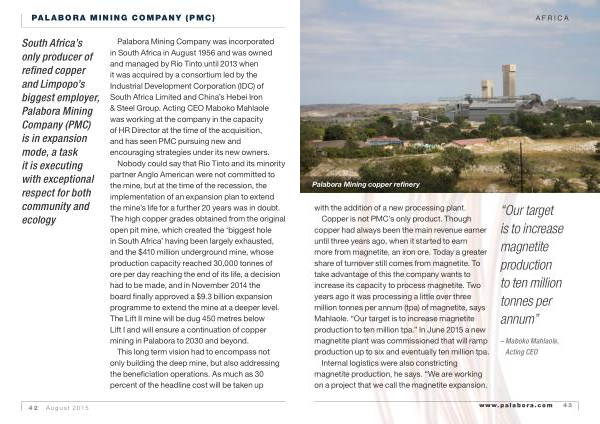 Copper is not PMC ’ s only product . Though copper had always been the main revenue earner until three years ago , when it started to earn more from magnetite , an iron ore . Today a greater share of turnover still comes from magnetite . To take advantage of this the company wants to increase its capacity to process magnetite . Two years ago it was processing a little over three million tonnes per annum ( tpa ) of magnetite , says Mahlaole . “ Our target is to increase magnetite production to ten million tpa .” In June 2015 a new magnetite plant was commissioned that will ramp production up to six and eventually ten million tpa .