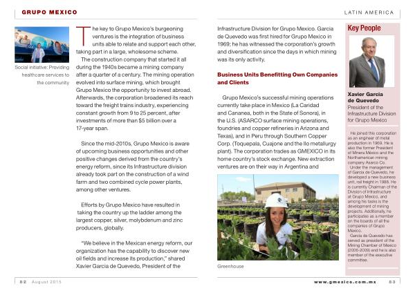 Infrastructure Division for Grupo Mexico . Garcia de Quevedo was first hired for Grupo Mexico in 1969 ; he has witnessed the corporation ’ s growth and diversification since the days in which mining was its only activity .