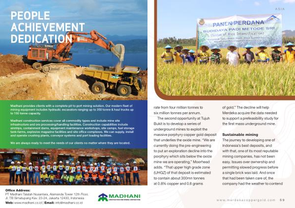 The second opportunity at Tujuh Bukit is to develop a series of underground mines to exploit the massive porphyry copper gold deposit that underlies the oxide mine . “ We are currently doing the pre-engineering to put an exploration decline into the porphyry which sits below the oxide mine we are operating ,” Moorhead adds . “ That upper high grade zone ( UHGZ ) of that deposit is estimated to contain about 300mn tonnes at 0.8 % copper and 0.8 grams of gold .” The decline will help Merdeka acquire the data needed to support a prefeasibility study for the first mass underground mine .