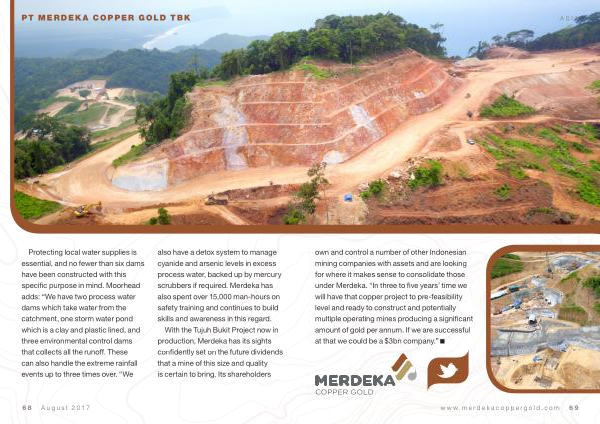 ASIA own and control a number of other Indonesian mining companies with assets and are looking for where it makes sense to consolidate those under Merdeka . “ In three to five years ’ time we will have that copper project to pre-feasibility level and ready to construct and potentially multiple operating mines producing a significant amount of gold per annum . If we are successful at that we could be a $ 3bn company .” www . merdekacoppergold . com 69