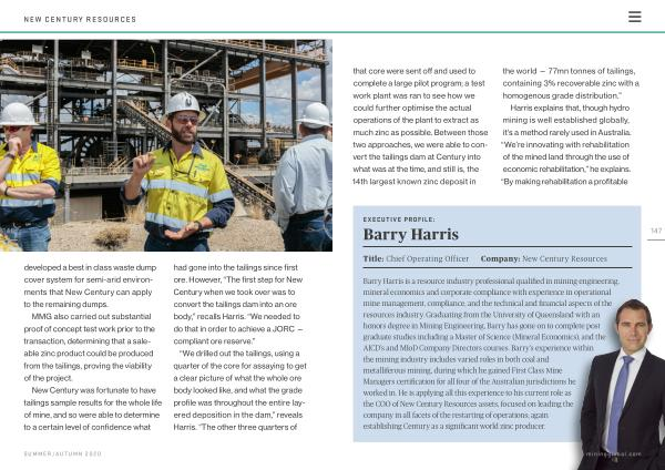 Barry Harris is a resource industry professional qualified in mining engineering , mineral economics and corporate compliance with experience in operational mine management , compliance , and the technical and financial aspects of the resources industry . Graduating from the University of Queensland with an honors degree in Mining Engineering , Barry has gone on to complete post graduate studies including a Master of Science ( Mineral Economics ), and the AICD ’ s and MIoD Company Directors courses . Barry ’ s experience within the mining industry includes varied roles in both coal and metalliferous mining , during which he gained First Class Mine Managers certification for all four of the Australian jurisdictions he worked in . He is applying all this experience to his current role as the COO of New Century Resources assets , focused on leading the company in all facets of the restarting of operations ; again establishing Century as a significant world zinc producer . miningglobal . com