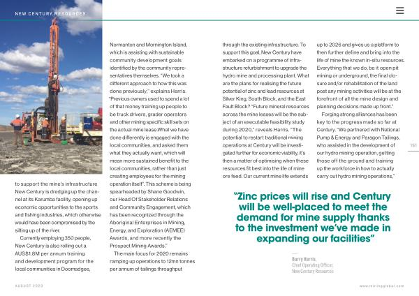 through the existing infrastructure . To support this goal , New Century have embarked on a programme of infrastructure refurbishment to upgrade the hydro mine and processing plant . What are the plans for realising the future potential of zinc and lead resources at Silver King , South Block , and the East Fault Block ? “ Future mineral resources across the mine leases will be the subject of an executable feasibility study during 2020 ,” reveals Harris . “ The potential to restart traditional mining operations at Century will be investigated further for economic viability , it ’ s then a matter of optimising when these resources fit best into the life of mine ore feed . Our current mine life extends up to 2026 and gives us a platform to then further define and bring into the life of mine the known in-situ resources . Everything that we do , be it open pit mining or underground , the final closure and / or rehabilitation of the land post any mining activities will be at the forefront of all the mine design and planning decisions made up front .”