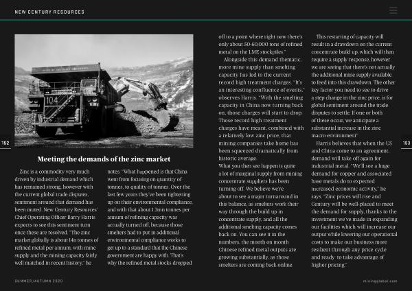 Harris believes that when the US and China come to an agreement , demand will take off again for industrial metal . “ We ’ ll see a huge demand for copper and associated base metals do to expected increased economic activity ,” he says . “ Zinc prices will rise and Century will be well-placed to meet the demand for supply , thanks to the investment we ’ ve made in expanding our facilities which will increase our output while lowering our operational costs to make our business more resilient through any price cycle and ready to take advantage of higher pricing .”