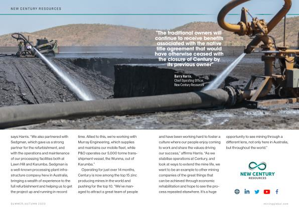 155 and have been working hard to foster a culture where our people enjoy coming to work and share the values driving our success ,” affirms Harris . “ As we stabilise operations at Century , and look at ways to extend the mine life , we want to be an example to other mining companies of the great things that can be achieved through economic rehabilitation and hope to see the process repeated elsewhere . It ’ s a huge opportunity to see mining through a different lens , not only here in Australia , but throughout the world .”