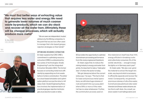 Dr Adair explains that CRC ORE ’ s commitment to optimising resource extraction ( ORE ) is underpinned by two suites of technologies : Grade Engineering ® and the Integrated Extraction Simulator ( IES ). The former focuses on extracting metal more efficiently by separating ore from waste before it enters comminution . The latter is a cloud-based simulation and optimisation platform across the mine to mill value chain . Grade Engineering therefore involves the implementation of practical gangue rejection technologies at production scale on sites .