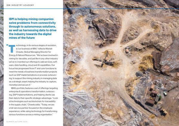 “ echnology , in its various stages of evolution , is our business at IBM ,” reflects Manish Chawla , Global Managing Director for Energy & Natural Resources . “ We ’ ve been involved in mining for decades , and just like in any other industry we ’ ve re-invented our offerings to add services , software , data handling , cloud and AI capabilities . Our focus has progressed from IT and core functions to meet the needs of business transformation projects such as SAP implementations or process outsourcing , to support the mining industry in managing data as a strategic asset ; helping the industry to capture , monetise and secure it .”