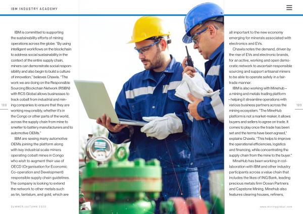 IBM is committed to supporting the sustainability efforts of mining operations across the globe . “ By using intelligent workflows on the blockchain to address social sustainability in the context of the entire supply chain , miners can demonstrate social responsibility and also begin to build a culture of innovation ,” believes Chawla . “ The work we are doing on the Responsible Sourcing Blockchain Network ( RSBN ) with RCS Global allows businesses to track cobalt from industrial and mining companies to ensure that they are working responsibly , whether it ’ s in the Congo or other parts of the world , across the supply chain from mine to smelter to battery manufacturers and to automotive OEMs .”