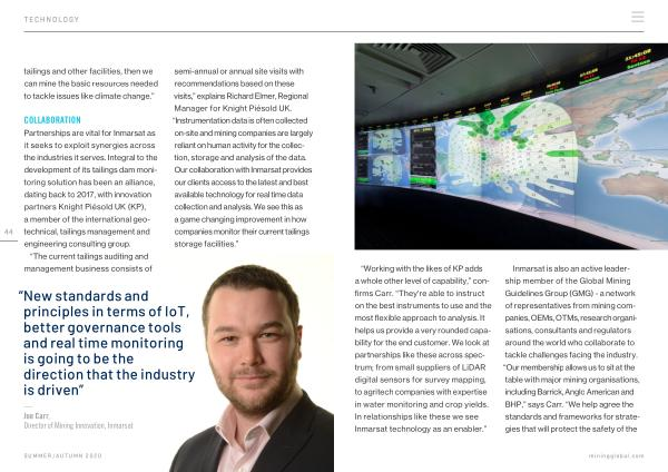 “ The current tailings auditing and management business consists of semi-annual or annual site visits with recommendations based on these visits ,” explains Richard Elmer , Regional Manager for Knight Piésold UK . “ Instrumentation data is often collected on-site and mining companies are largely reliant on human activity for the collection , storage and analysis of the data . Our collaboration with Inmarsat provides our clients access to the latest and best available technology for real time data collection and analysis . We see this as a game changing improvement in how companies monitor their current tailings storage facilities .”