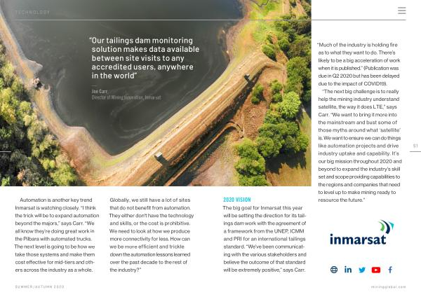 Automation is another key trend Inmarsat is watching closely . “ I think the trick will be to expand automation beyond the majors ,” says Carr . “ We all know they ’ re doing great work in the Pilbara with automated trucks . The next level is going to be how we take those systems and make them cost effective for mid-tiers and others across the industry as a whole .