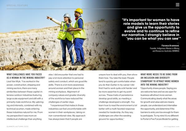 Liezl Van Wyk : “ I ’ ve worked in the power , construction , shipping and mining sectors ; there are many similarities between these capital-intensive outdoor industries featuring large scale equipment and still with a primarily male workforce . My upbringing and interests , combined with my technical acumen , made entering these industries natural for me . From my perspective it was more an intellectual challenge than anything else . I did encounter that one had to pay a lot more attention to personal safety and conduct , which are good life skills . There is a lot more awareness around women and their place in the mining workplace . Alignment of company values and greater diversity of the workforce have reduced the challenges of earlier days .