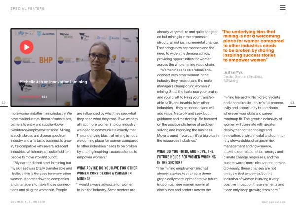“ My career did not start in mining but my skill set was totally transferable and I believe this is the case for many other women . It comes down to companies and managers to make those connections and plug the women in . People are influenced by what they see , what they hear , what they read . If we want to attract more women into our industry we need to communicate exactly that . The underlying bias that mining is not a welcoming place for women compared to other industries needs to be broken by sharing inspiring success stories to empower women .”