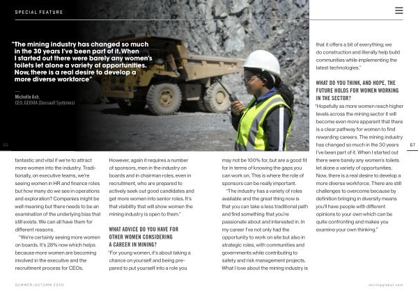 “ Hopefully as more women reach higher levels across the mining sector it will become even more apparent that there is a clear pathway for women to find rewarding careers . The mining industry has changed so much in the 30 years I ’ ve been part of it . When I started out there were barely any women ’ s toilets let alone a variety of opportunities . Now , there is a real desire to develop a more diverse workforce . There are still challenges to overcome because by definition bringing in diversity means you ’ ll have people with different opinions to your own which can be quite confronting and makes you examine your own thinking .”