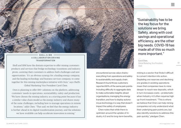 Oren is planning to offer 100 + solutions on the platform , addressing customers ’ needs in operations , sustainability , safety and production . “ We have chosen the mining industry as a starting point because it has a similar value chain model as the energy industry and shares many of the same challenges , including how to manage operations in remote locations ,” adds Chen . “ That said , we feel that the energy industry is further ahead in its digital transformation journey , and the solutions we have available can help accelerate innovation in mining .”