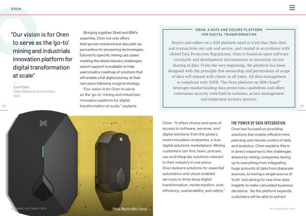 Chen . “ It offers choice and ease of access to software , services , and digital solutions from the globe ’ s most innovative companies , a true digital solutions marketplace . Mining customers can find , learn , procure , use and integrate solutions relevant to their industry in one place . Oren delivers solutions for essential automation and cloud-enabled services to drive deep digital transformation , modernisation , costefficiency , sustainability , and safety .”