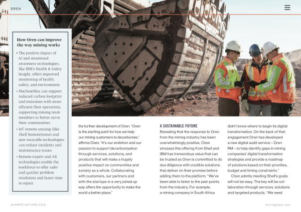 the further development of Oren . “ Oren is the starting point for how we help our mining customers to decarbonise ,” affirms Chen . “ It ’ s our ambition and our passion to support decarbonisation through services , solutions , and products that will make a hugely positive impact on communities and society as a whole . Collaborating with customers , our partners and with the startups in a very joined up way offers the opportunity to make the world a better place .”