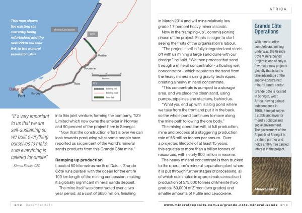 Ramping up production Located 50 kilometres north of Dakar , Grande Côte runs parallel with the ocean for the entire 100 km length of the mining concession , making it a globally significant mineral sands deposit .
