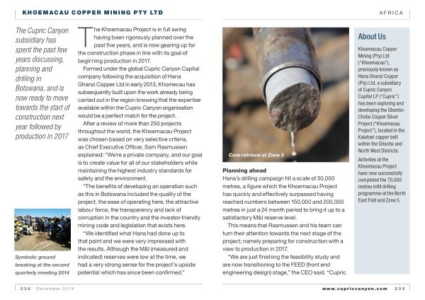 Khoemacau Copper Mining ( Pty ) Ltd (“ Khoemacau ”), previously known as Hana Ghanzi Copper ( Pty ) Ltd , a subsidiary of Cupric Canyon Capital LP (“ Cupric ”) has been exploring and developing the Ghantsi- Chobe Copper Silver Project (“ Khoemacau Project ”), located in the Kalahari copper belt within the Ghantsi and North West Districts .