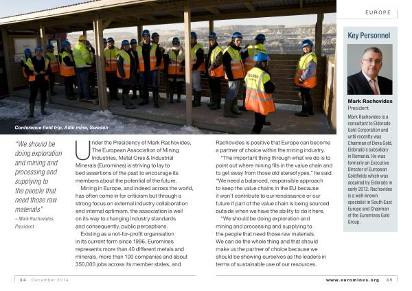 Under the Presidency of Mark Rachovides , The European Association of Mining Industries , Metal Ores & Industrial Minerals ( Euromines ) is striving to lay to bed assertions of the past to encourage its members about the potential of the future .