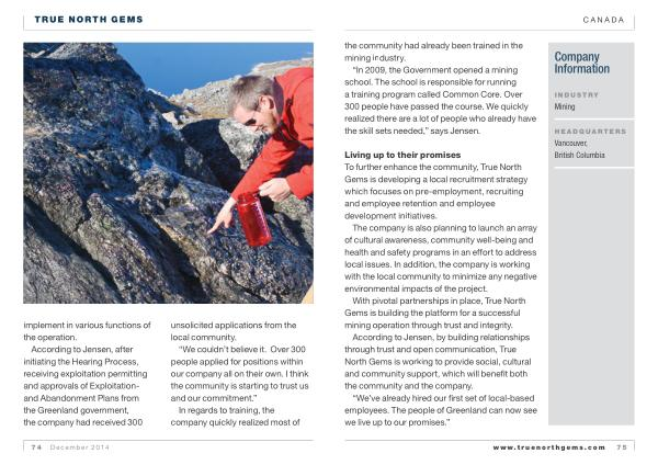 Living up to their promises To further enhance the community , True North Gems is developing a local recruitment strategy which focuses on pre-employment , recruiting and employee retention and employee development initiatives .