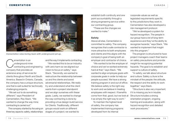 Cementation is an underground mine contracting and engineering company that provides an extensive array of services for clients throughout North and South America . Based in Ontario , Canada , the company has a unique structure , one that is well suited for technically challenging projects .