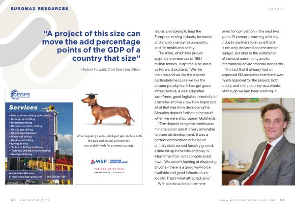 “ The deposit has great continuous mineralisation and it is very amenable to open pit development . It was a perfect combination of being on entirely state owned forestry ground , a little bit up in the hills and only 17 kilometres from a reasonable sized town . We weren ’ t looking at displacing anyone - there is a good workforce available and good infrastructure locally . That ’ s what attracted us in .” With construction at the mine billed for completion in the next two years , Euromax is working with key industry partners to ensure that it is not only delivered on time and on budget , but also to the satisfaction of the local community and to international environmental standards .