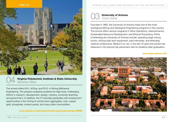 Founded in 1885 , the University of Arizona holds one of the most prestigious Mining and Geological Engineering programs in the country . The school offers various programs in Mine Operations , Geomechanics , Sustainable Resource Development , and Mineral Processing . Perks of attending the University of Arizona include : operating large mining trucks , utilizing high-tech equipment , paid internship , and attending national conferences . Believe it or not , in the last 10 years the school has obtained a 100-percent job placement rate for students after graduation .