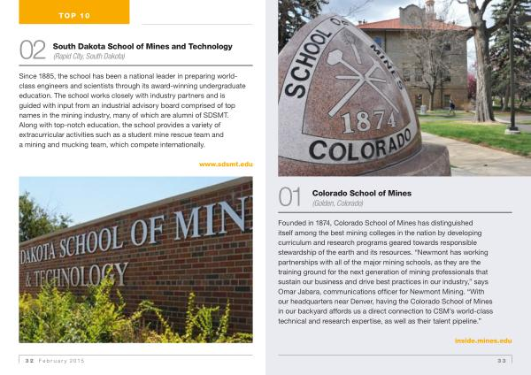 Founded in 1874 , Colorado School of Mines has distinguished itself among the best mining colleges in the nation by developing curriculum and research programs geared towards responsible stewardship of the earth and its resources . “ Newmont has working partnerships with all of the major mining schools , as they are the training ground for the next generation of mining professionals that sustain our business and drive best practices in our industry ,” says Omar Jabara , communications officer for Newmont Mining . “ With our headquarters near Denver , having the Colorado School of Mines in our backyard affords us a direct connection to CSM ’ s world-class technical and research expertise , as well as their talent pipeline .”