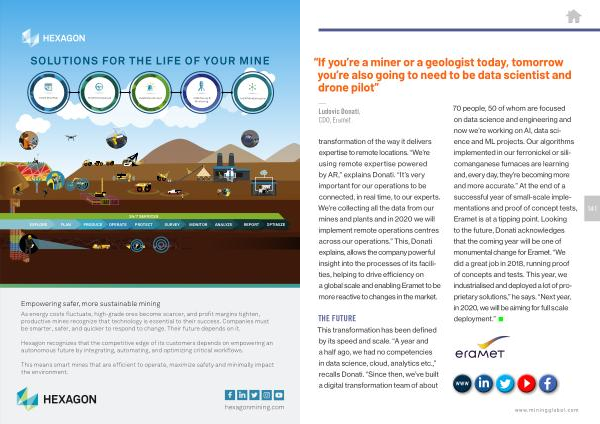 transformation of the way it delivers expertise to remote locations . “ We ’ re using remote expertise powered by AR ,” explains Donati . “ It ’ s very important for our operations to be connected , in real time , to our experts . We ’ re collecting all the data from our mines and plants and in 2020 we will implement remote operations centres across our operations .” This , Donati explains , allows the company powerful insight into the processes of its facilities , helping to drive efficiency on a global scale and enabling Eramet to be more reactive to changes in the market .
