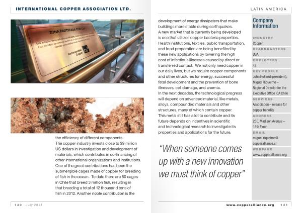 LATIN AMERICA development of energy dissipaters that make buildings more stable during earthquakes . A new market that is currently being developed is one that utilizes copper bacteria properties . Health institutions , textiles , public transportation , and food preparation are being benefited by these new applications by lowering the high cost of infectious illnesses caused by direct or transferred contact . We not only need copper in our daily lives , but we require copper components and other structures for energy , successful fetal development and the prevention of bone illnesses , cell damage , and anemia . In the next decades , the technological progress will depend on advanced material , like metals , alloys , compounded materials and other structures , many of which contain copper . This metal still has a lot to contribute and its future depends on incentives in scientific and technological research to investigate its properties and applications for the future .