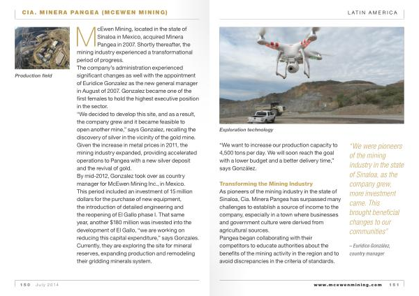 McEwen Mining , located in the state of Sinaloa in Mexico , acquired Minera Pangea in 2007 . Shortly thereafter , the mining industry experienced a transformational period of progress . The company ’ s administration experienced significant changes as well with the appointment of Euridice Gonzalez as the new general manager in August of 2007 . Gonzalez became one of the first females to hold the highest executive position in the sector . “ We decided to develop this site , and as a result , the company grew and it became feasible to open another mine ,” says Gonzalez , recalling the discovery of silver in the vicinity of the gold mine . Given the increase in metal prices in 2011 , the mining industry expanded , providing accelerated operations to Pangea with a new silver deposit and the revival of gold . By mid-2012 , Gonzalez took over as country manager for McEwen Mining Inc ., in Mexico . This period included an investment of 15 million dollars for the purchase of new equipment , the introduction of detailed engineering and the reopening of El Gallo phase I . That same year , another $ 180 million was invested into the development of El Gallo , “ we are working on reducing this capital expenditure ,” says Gonzales . Currently , they are exploring the site for mineral reserves , expanding production and remodeling their gridding minerals system .