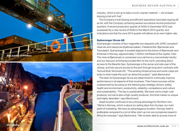 Sydvaranger Gruve AS Sydvaranger consists of four magnetite iron deposits with JORC compliant reserves and resources ( Kjellmannsåsen , Fisketind Øst , Bjørnevatn and Tverrdalen ). Sydvaranger is located adjacent to the towns of Bjørnevatn and Kirkenes in Norway , approximately 1,500km northeast of the capital , Oslo . The mine at Bjørnevatn is connected via a rail line to a concentrator facility and ice-free port at Kirkenes located 8km to the north , providing direct access to the Barents Sea . Sydvaranger is the owner and sole user of the railway , and has secure access to the port through long-term contracts with Tschudi Bulk Terminals AS . “ The existing infrastructure and world-class ore body is what made this such an attractive project ,” adds Beckmand .