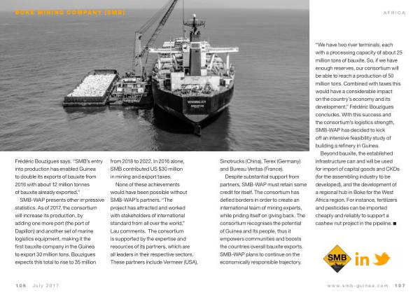 “ We have two river terminals , each with a processing capacity of about 25 million tons of bauxite . So , if we have enough reserves , our consortium will be able to reach a production of 50 million tons . Combined with taxes this would have a considerable impact on the country ’ s economy and its development ,” Frédéric Bouzigues concludes . With this success and the consortium ’ s logistics strength , SMB-WAP has decided to kick off an intensive feasibility study of building a refinery in Guinea .