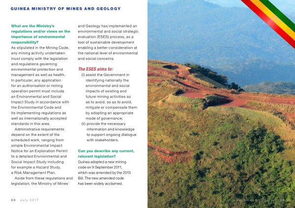 Aside from these regulations and legislation , the Ministry of Mines and Geology has implemented an environmental and social strategic evaluation ( ESES ) process , as a tool of sustainable development enabling a better consideration at the national level of environmental and social concerns .